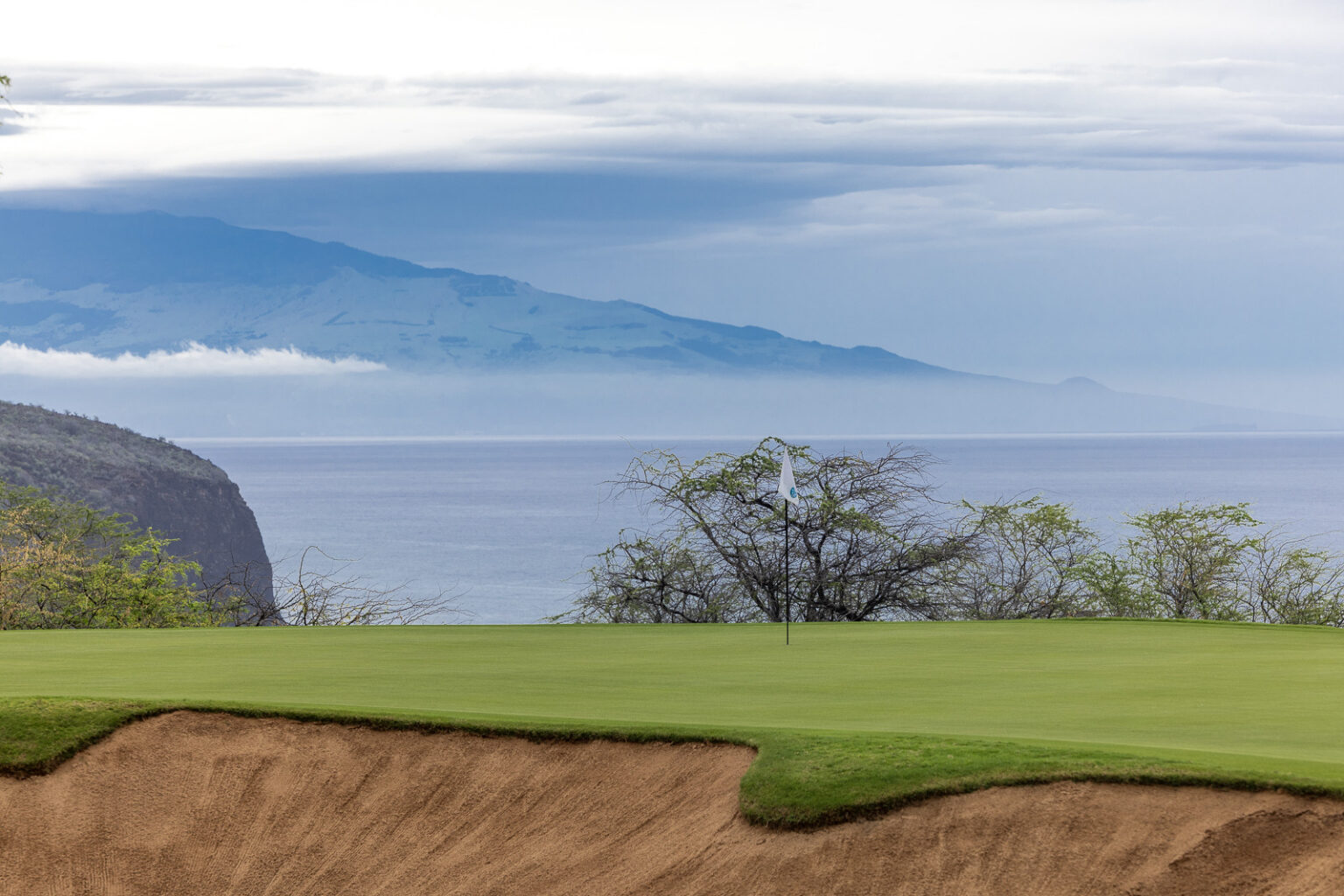 The course sits along the southern coastline of Lānaʻi, with the Pacific Ocean visible from nearly every hole. Several holes play directly along the cliffs, creating some of the most dramatic visuals you’ll find anywhere in golf.