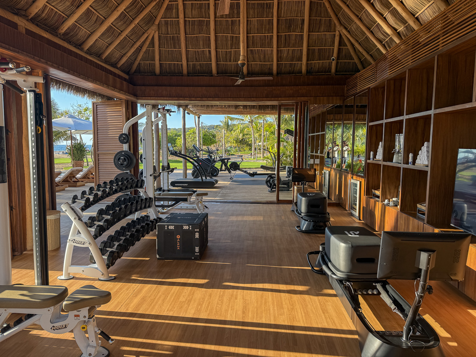 On the other side, there’s a beach bar, a fully stocked outdoor gym, a small pool and hot tub, and what might be the most scenic set of sports courts I’ve ever seen: tennis, basketball, pickleball, and padel, all right on the beach with the Pacific Ocean as your backdrop.