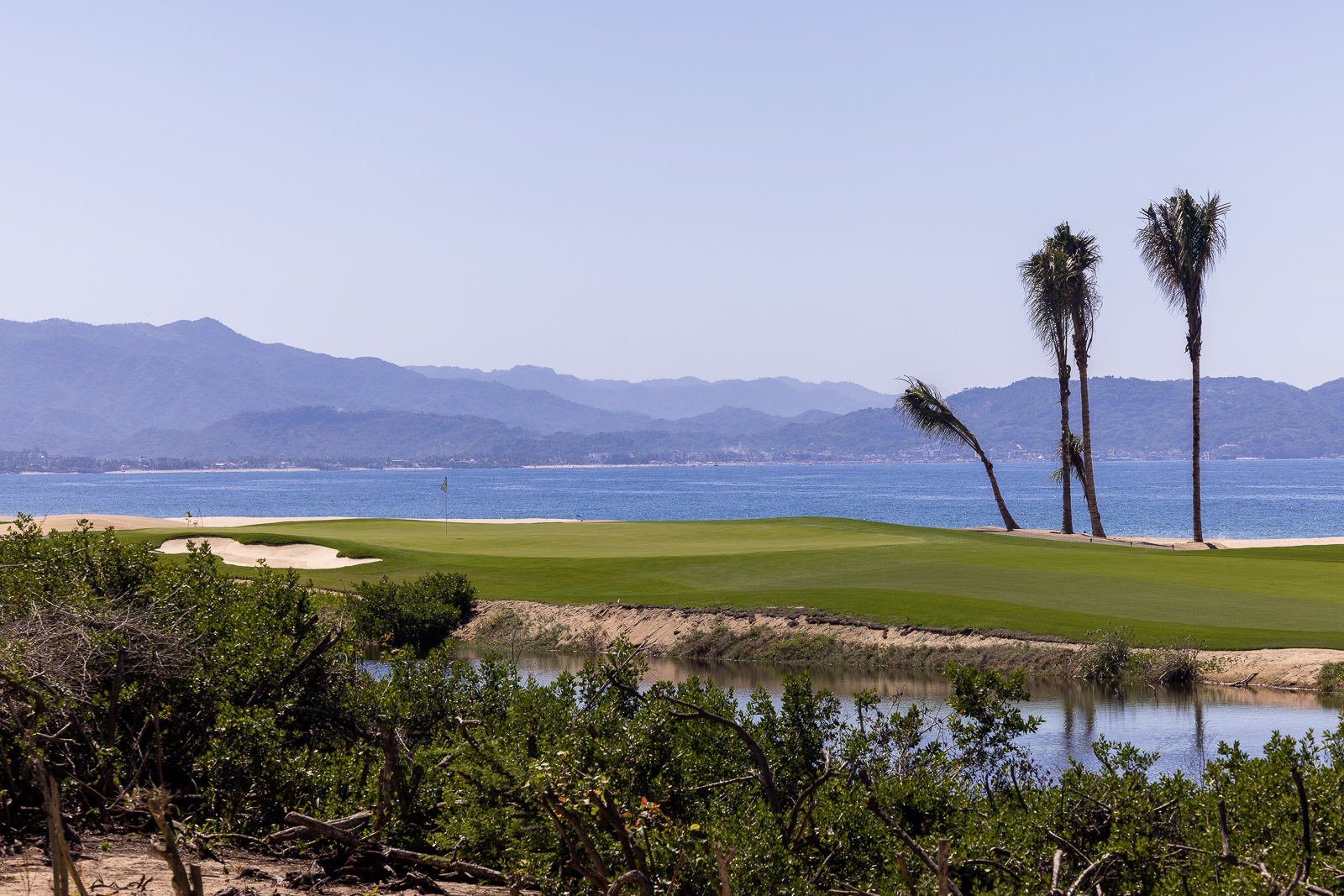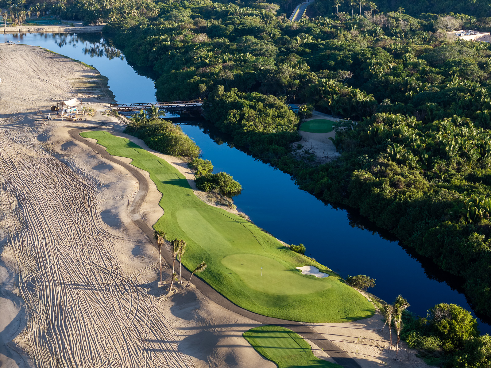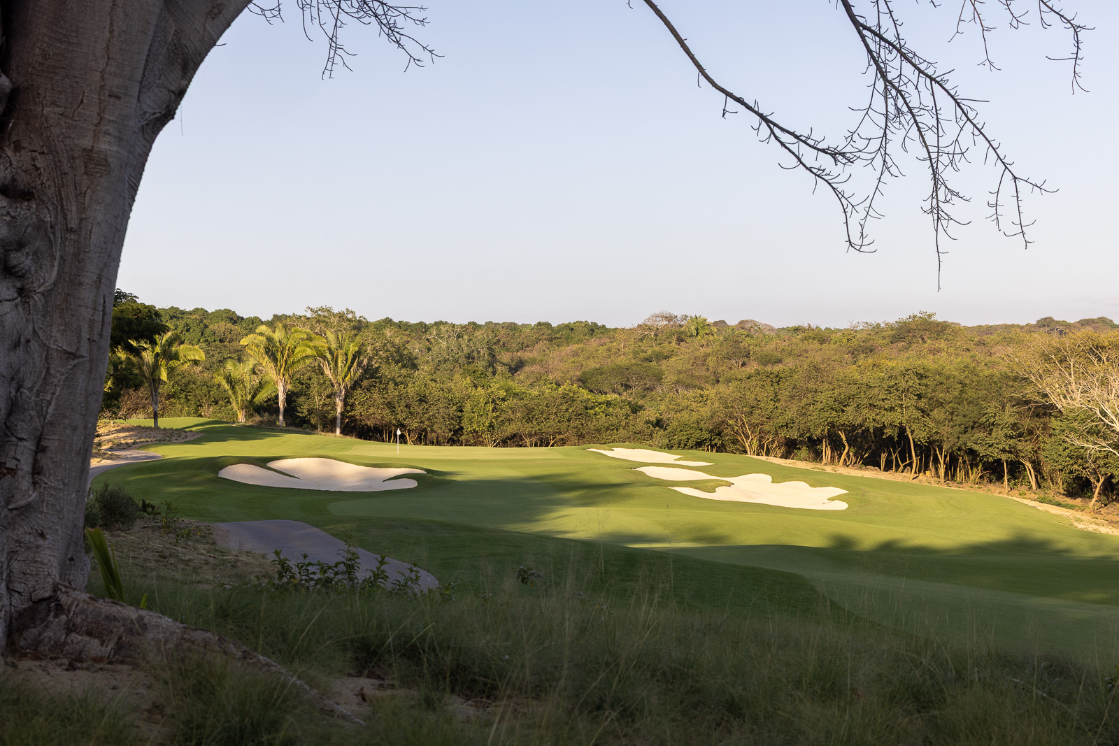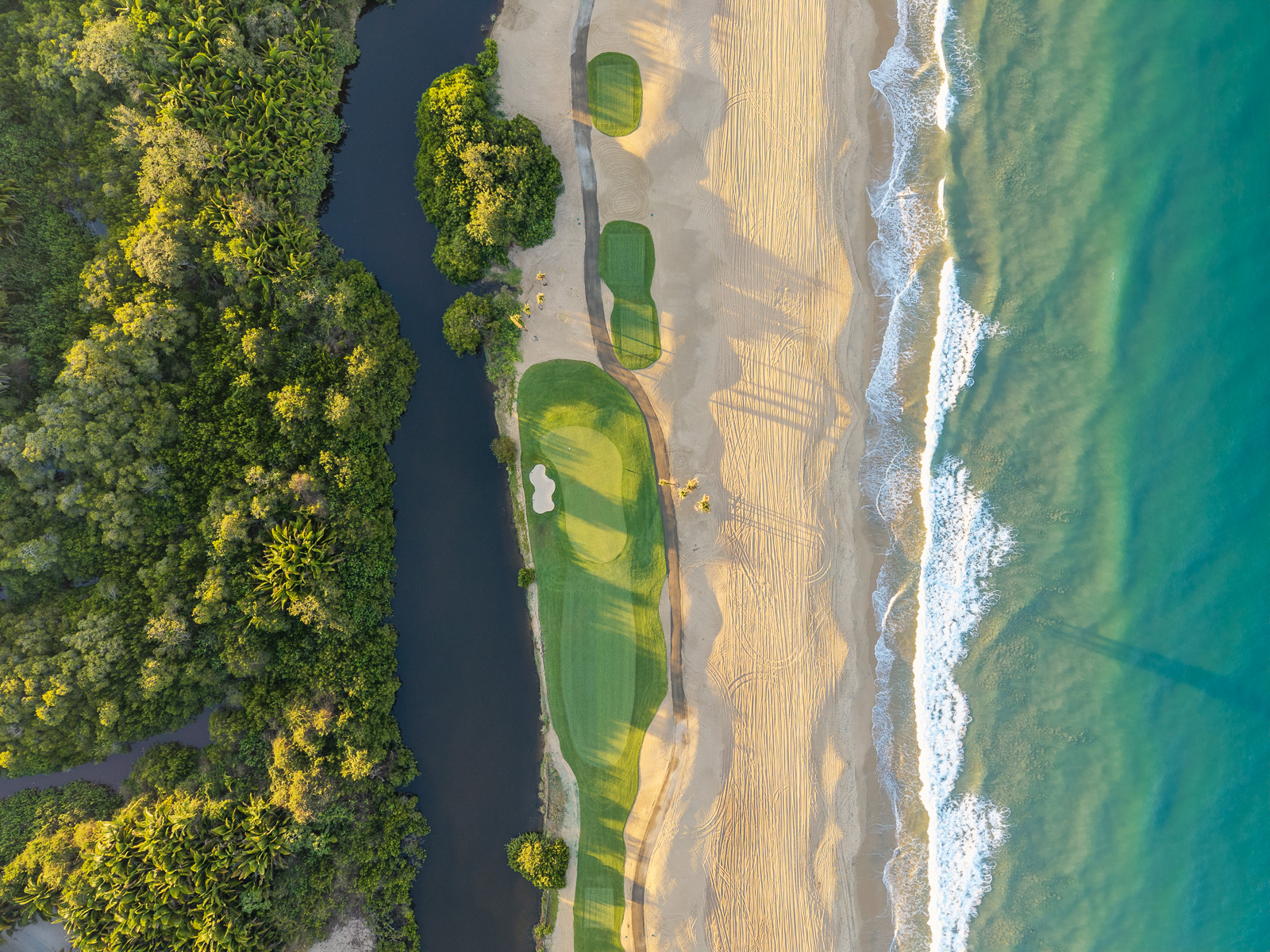 You’re hitting over the mangrove estuary to a green backed by the open ocean, with mountains rising in the distance beyond. It’s beautiful, memorable, and genuinely thought-provoking. This is one of the best individual shots on the entire golf course.