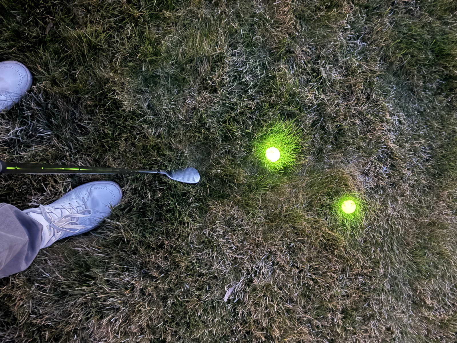 A few seconds under the UV light and the balls lit up noticeably. Hold the light on them longer, and they get brighter and last longer — the advertised 15-minute window held up pretty accurately in my experience. On a nearly pitch-black course, you could see these things clearly even 15 minutes after their last charge. But I found myself charging them every 5 minutes or so for maximum effect.